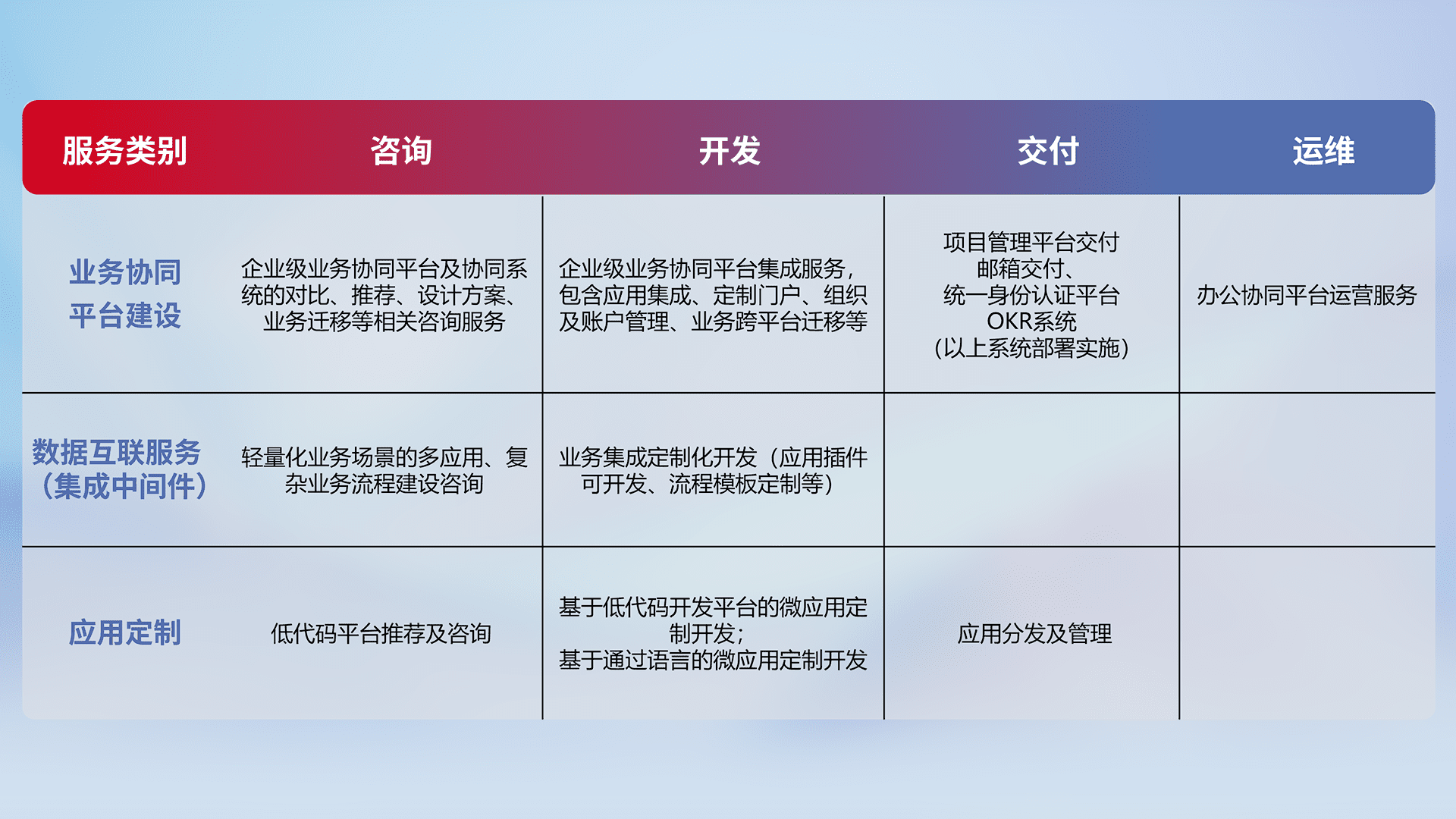 针对钉钉、、企微、、、、IDaas等平台级产品提供产品的规划、、、方案、、交付、、定制化开发等服务,,实现如统一协同办公、、、智能客户服务、、混合会议管理、、、、智能数据查询、、、等业务场景,,,实现数字化转型。。。。
